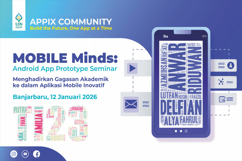 Banjarbaru, 13/01/2026 — Program Studi Teknologi Informasi Universitas Islam Negeri (UIN) Antasari menggelar kegiatan Mobile Minds: Android App Prototype Seminar, sebuah forum akademik yang menampilkan prototipe aplikasi Android hasil gagasan dan pengembangan karya mahasiswa. Kegiatan ini dilaksanakan di Aula Seminar 1.2 Gedung Saintek Kampus 2 UIN Antasari Banjarbaru, pada Senin, 12/01/2026.